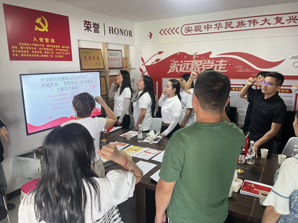 为不断深化党建引领作用,全面创新服务形式,实现党建工作与社会团体建设功能互补、共建共促,4月26日,我会党支部与云南连心社区照顾服务中心和连心基金会党支部、昆明市青年志愿者协会党支部、昆明市五华区阳光公益爱心联盟党支部以重温入党誓词、聆听党纪专题党课、寓教于乐党建活动等形式开展“社会组织党建联动党知共提升 – 经验共享、党纪学习、党识增进”主题党日活动。